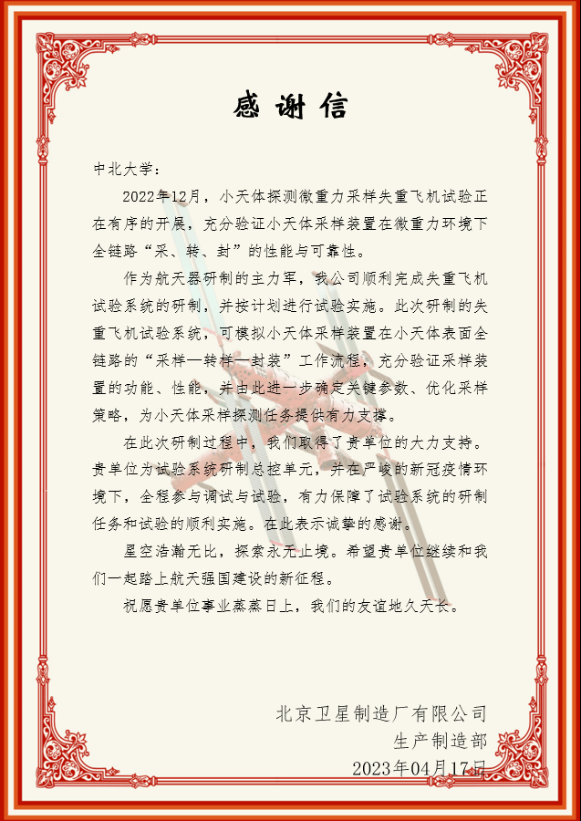 助力航天工程!中北大学仪器与电子学院收到北京卫星制造厂发来的感谢信。该学院李永红教授团队承担了北京卫星制造厂“小天体探测重力采样失重飞机试验系统总控单元”的研制工作,并在严峻的新冠疫情条件下全程参与调试与实验,保证了实验系统的研制任务和实验的顺利实施,为小天体采样探测任务提供了有力支撑。