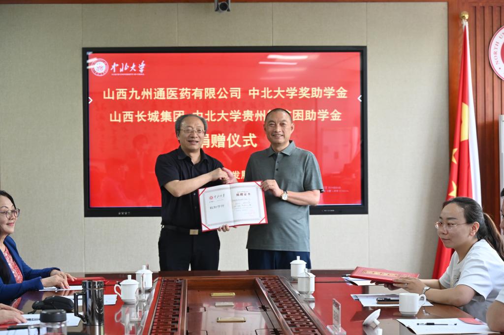 5月19日,我校八十二周年校庆日之际,山西九州通医药有限公司、山西长城保安服务有限公司分别在我校设立湖北“九州通”励志成才奖学金和贵州“长城”励志成才奖学金。副校长赵贵哲出席签约仪式并为山西九州通医药有限公司董事长王亚雄及山西省贵州商会会长、山西长城保安服务有限公司董事长毛朗颁发校友聘书。学校教育发展基金会负责人代表学校接受捐赠。学生工作部、国内交流合作部相关负责人参加仪式。
