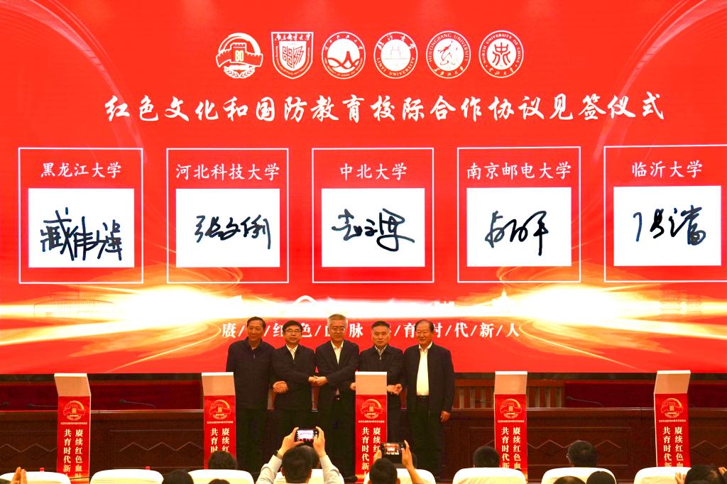 研讨会上,前身均为八路军抗战时期我党创办的五所高校共同签署红色文化和国防教育校际合作协议。根据协议,五校将围绕红色教育与国防教育领域,通过智库联合、资源共建、课程互认等方式,搭建红色教育资源共享平台,实现优质教育资源互通共享;依托科研合作、实践育人、研学创新等途径,构建红色文化与国防教育协同创新机制,推动理论研究与实践应用深度融合;在革命遗产数字化保护工作中,开展技术协作、云端展示等合作,并联合进行成果推广,以数字化手段赋能红色文化传承。