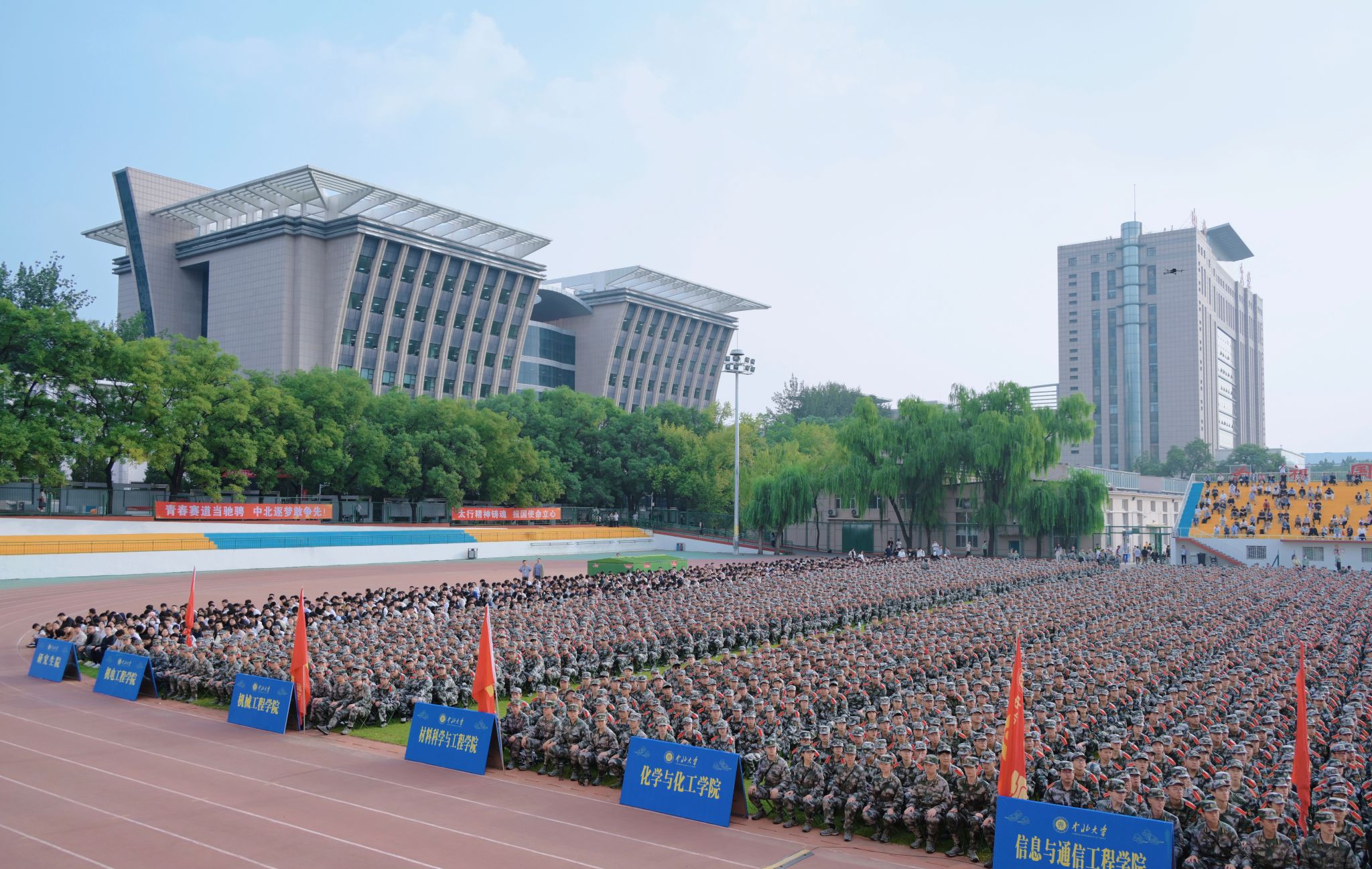 9月15日,我校2025级新生开学典礼在主体育场隆重举行,今年我校共有来自祖国各地9602名本科生、2487名硕士研究生和326名博士研究生顺利入学。全体校领导,校友代表、北方凌云工业集团有限公司党委副书记、纪委书记王延龙,校友代表、冀南钢铁集团有限公司党委书记、董事长王树华出席。校党委书记张晓永出席并为新生代表佩戴校徽。校长陈钱致欢迎词。副校长尹建平主持。学校各职能部门、各学院负责人,新生班主任、辅导员、家长和校友代表参加。