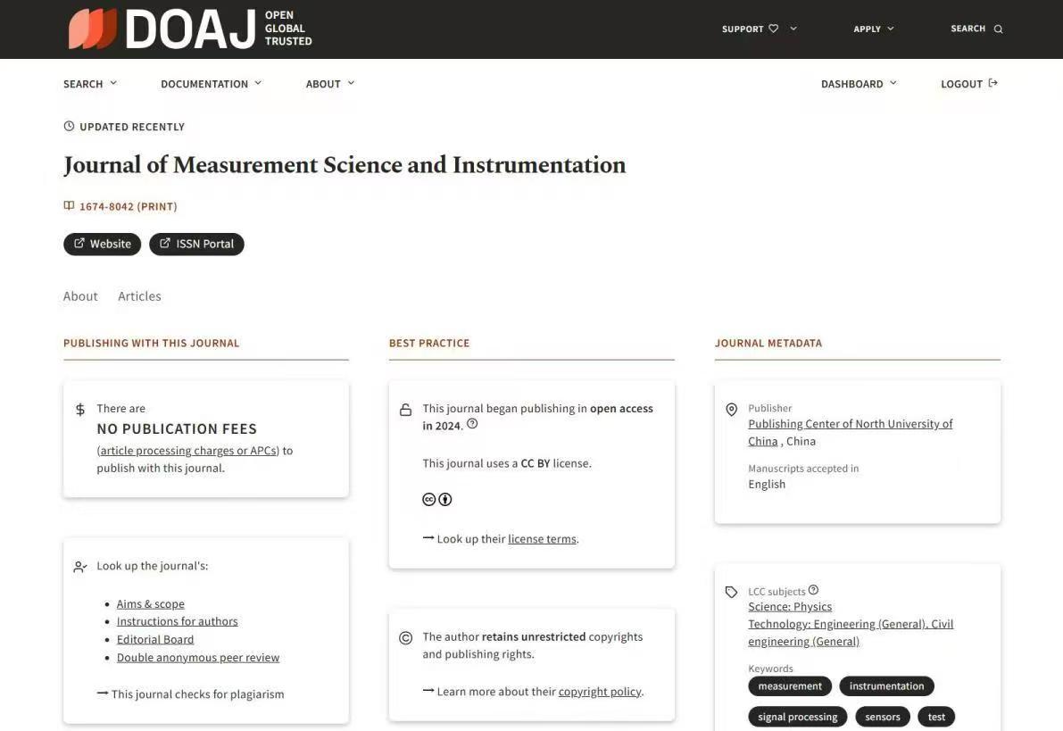 9月22日,由我校主办的英文学术期刊Journal of Measurement Science and Instrumentation(JMSI)正式被国际主流数据库Directory of Open Access Journals(DOAJ)收录,标志着JMSI 国际化进程迈出了重要一步。