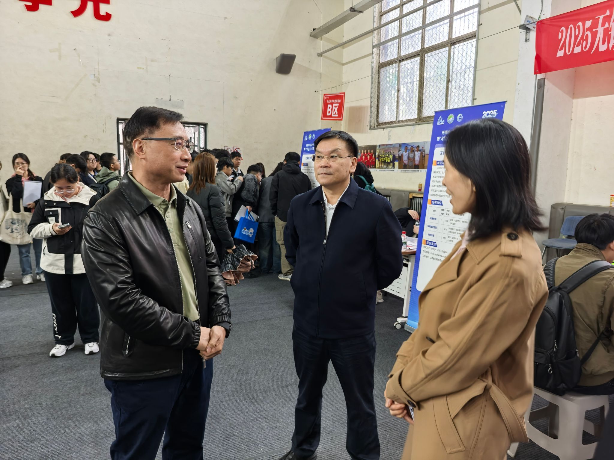 在招聘会现场,31 家梁溪区优质企业的796 个招聘岗位虚位以待。校长陈钱与无锡市人力资源和社会保障局及无锡市梁溪区相关负责人进行亲切交流。双方围绕学校学科发展如何更好地对接地方产业需求、深化校企合作模式创新等话题交换意见,进一步明确了校地协同育人、合作发展的方向。