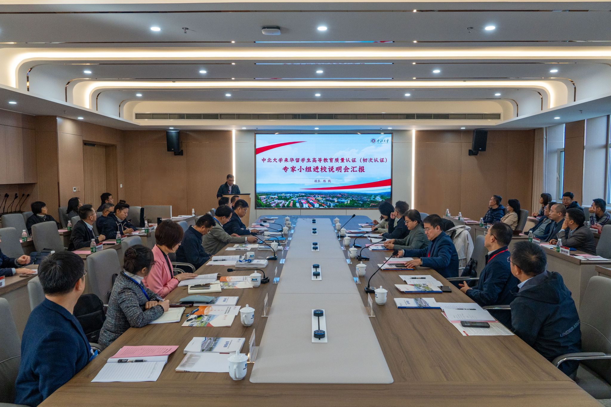 校长陈钱围绕学校总体办学情况、来华留学生培养特色与成效、未来改进方向三大核心,系统汇报了学校来华留学生高等教育工作的推进进展及认证自评自改情况。他指出,在“一强、两保、三提升”的国际交流合作指导思想引领下,学校已形成鲜明的留学生培养特色与成效:学校以主动服务国家“一带一路”建设为使命,重点招收培养“一带一路”沿线国家留学生;以高层次国际化人才培养为目标,将学校培养理念融入来华留学生培养各环节;依托优势科研资源培养国际化工程技术人才;依托学校优秀办学文化,筑牢来华留学生素养根基;以“校地融汇、知晋友晋”为路径,促进区域文化传播交流;以优质精准服务为宗旨,做好来华留学生服务保障工作,实现了来华留学生招收人数、专业、国别大幅增加,来华留学生培养质量和国际化办学水平显著提升的丰硕成效。