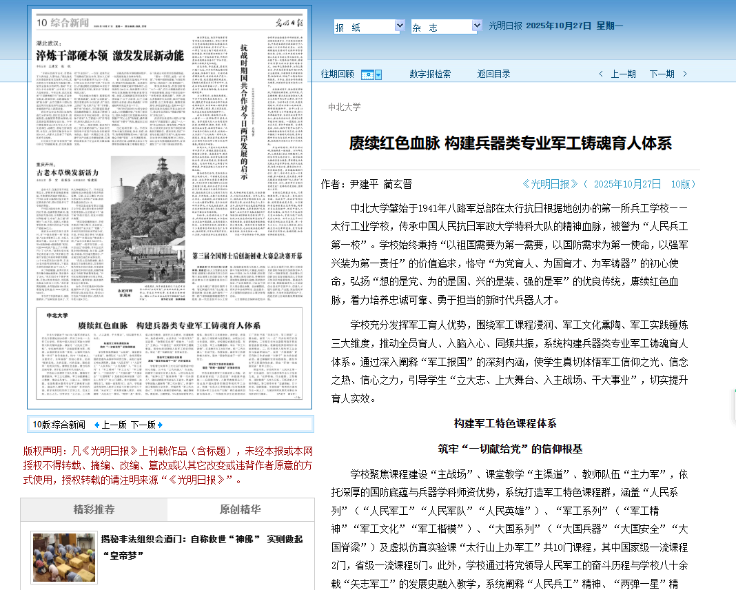 10月27日,《光明日报》第10版“综合新闻”版刊发我校尹建平教授、蔺玄晋教授联合署名文章——《赓续红色血脉 构建兵器类专业军工铸魂育人体系》,系统展现学校依托军工办学特色、创新人才培养模式的实践成果。