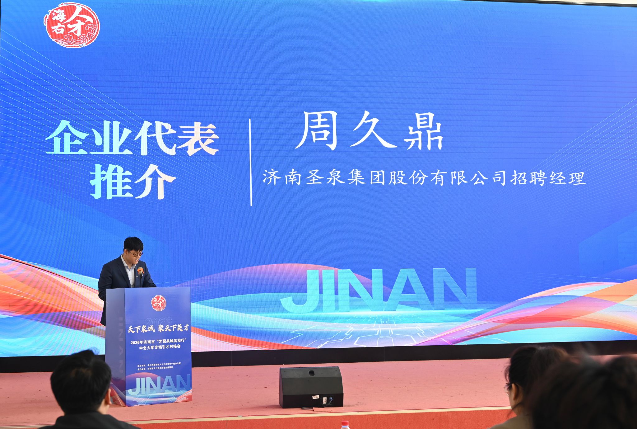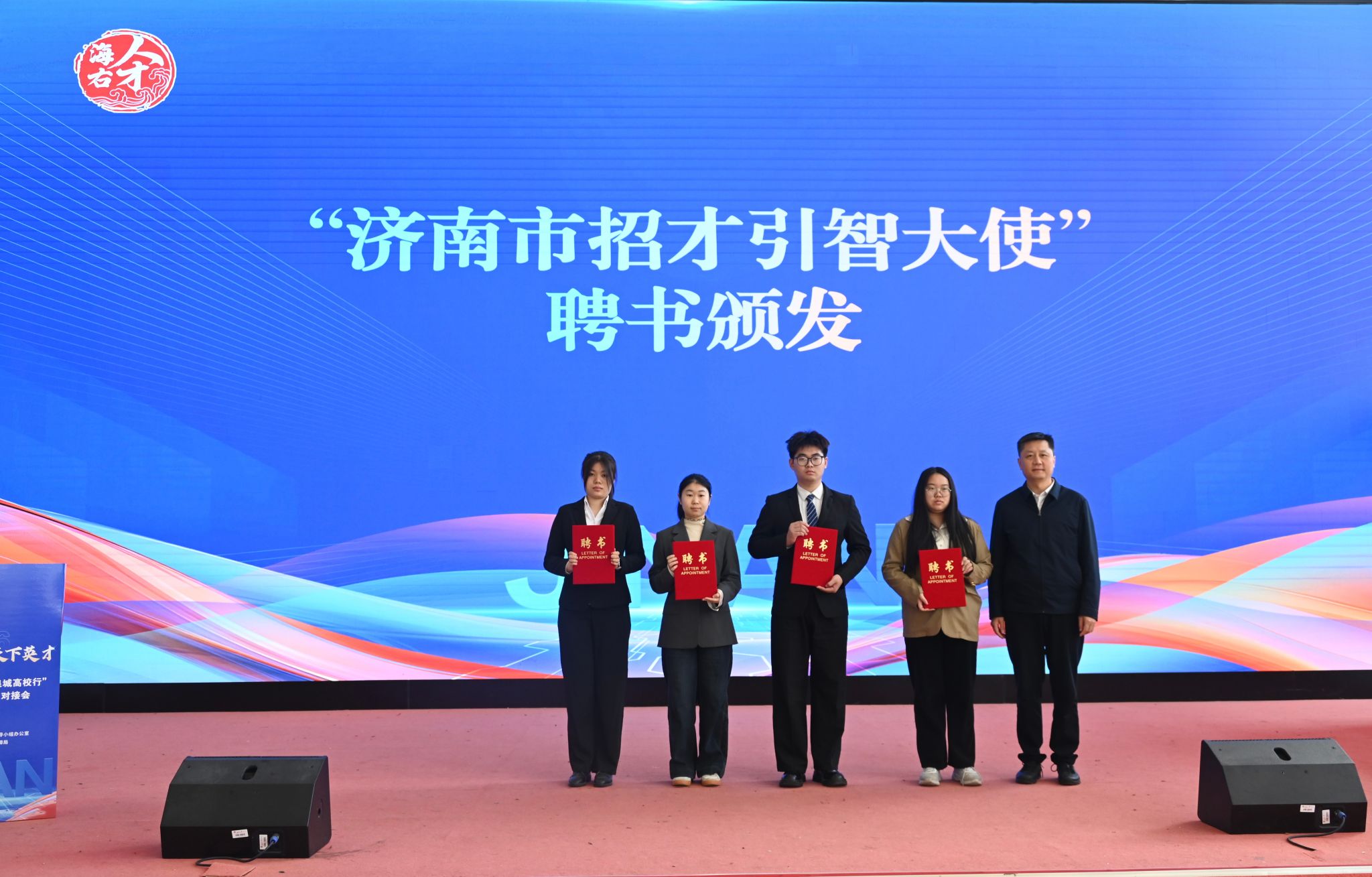 济南市人力资源社会保障局副局长陈明远为我校4名学生代表颁发“招才引智大使”聘书;济南市人才服务中心规划引进部副部长陈雅梦就济南市人才政策进行推介;企业代表圣泉集团股份有限公司招聘经理周久鼎围绕企业文化、人才培养、薪资福利待遇、人才保障政策等方面进行宣讲,为同学们展现泉城企业的实力与温度。