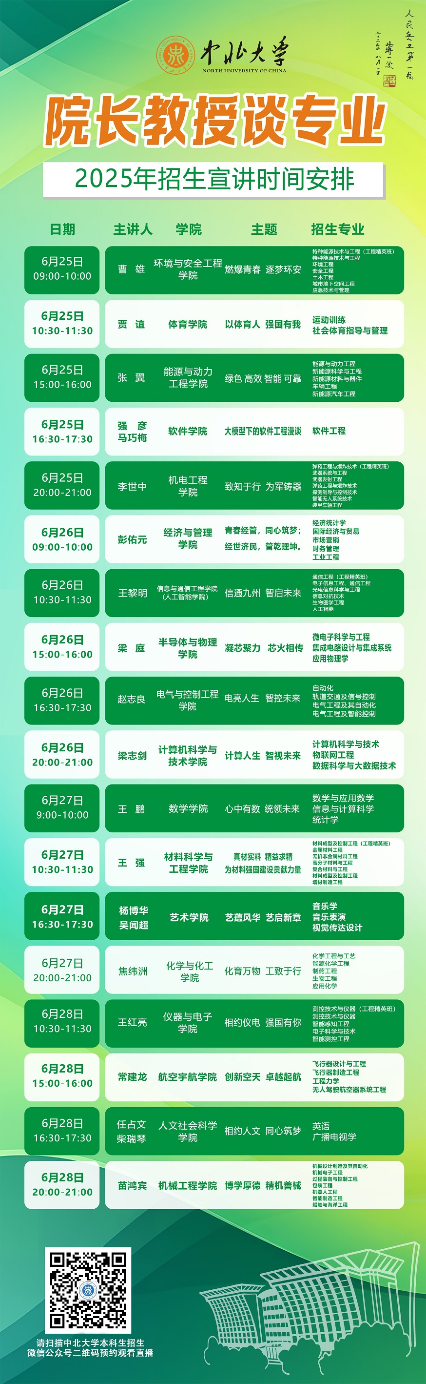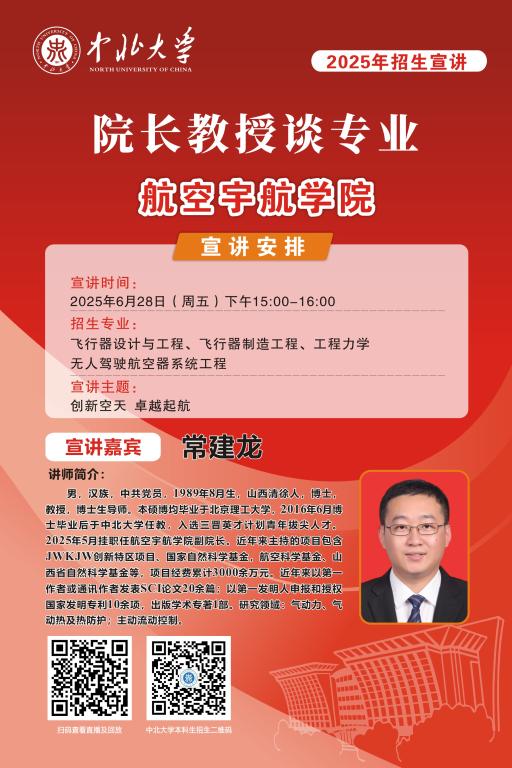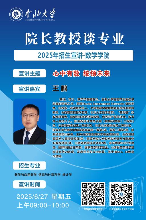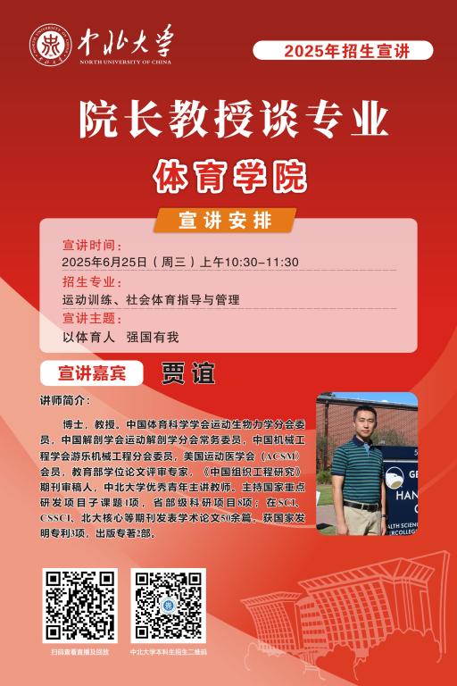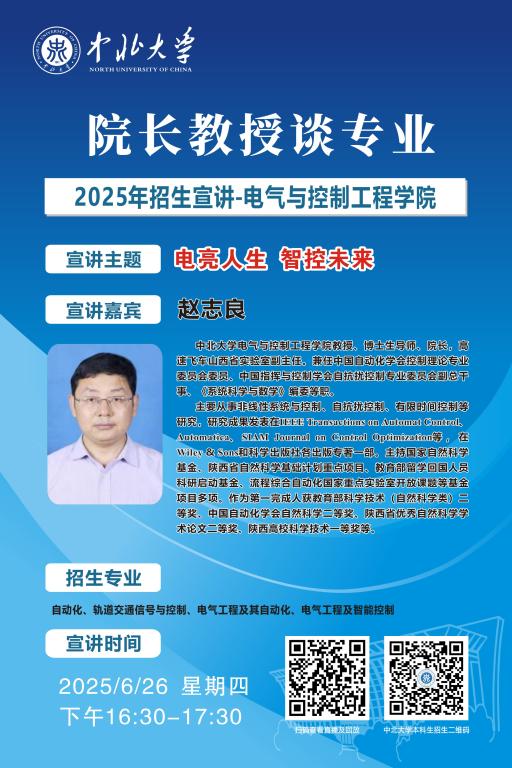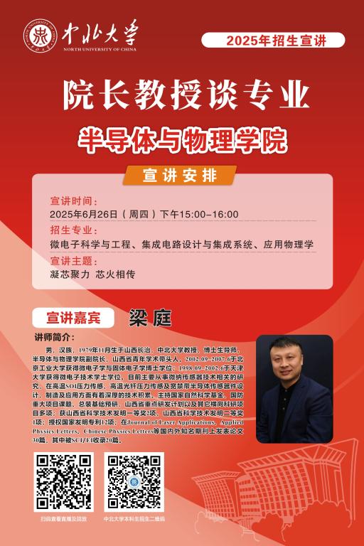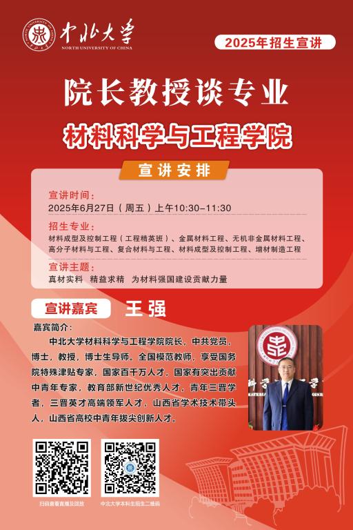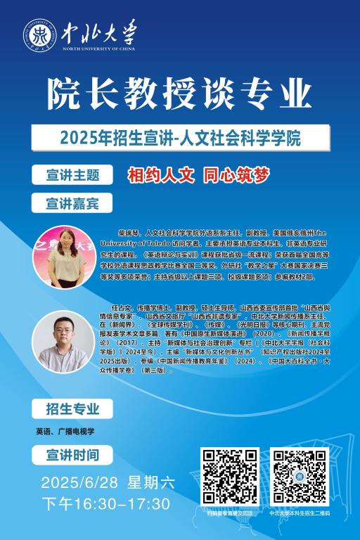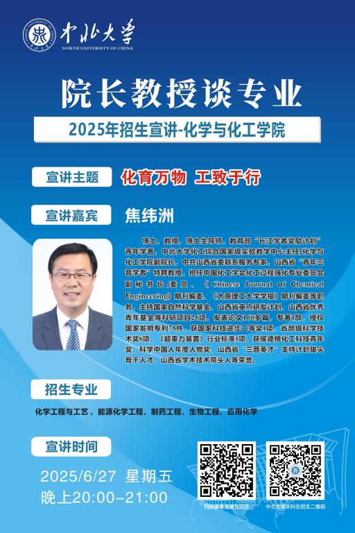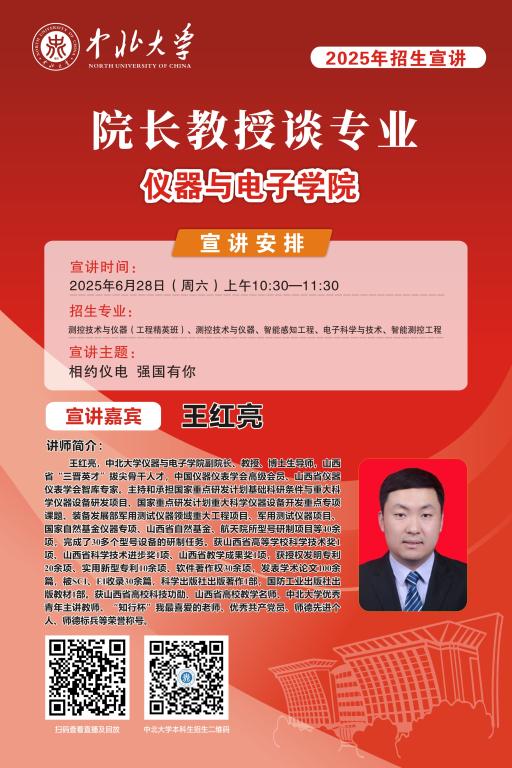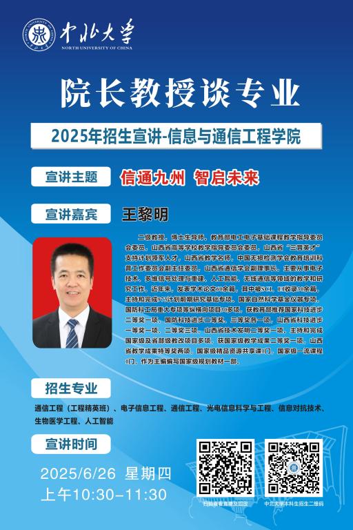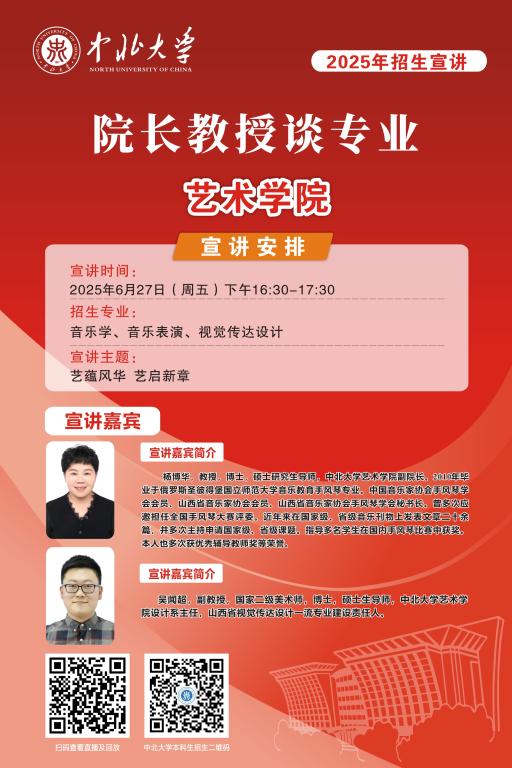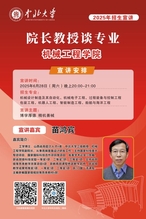 未来的大学学子们,你们已经完成了十二年寒窗苦读,完成了一次重要的人生答卷,即将开启人生新的征程。在这重要的人生十字路口,将会面临新的选择,为了让大家进一步了解中北大学,我们于6月25至28日特别推出 “院长教授谈专业”系列直播活动,由各院学术大咖们带你深入了解中北大学各专业情况,并现场与大家进行沟通交流,答疑解惑,一定记得届时扫码观看哦!