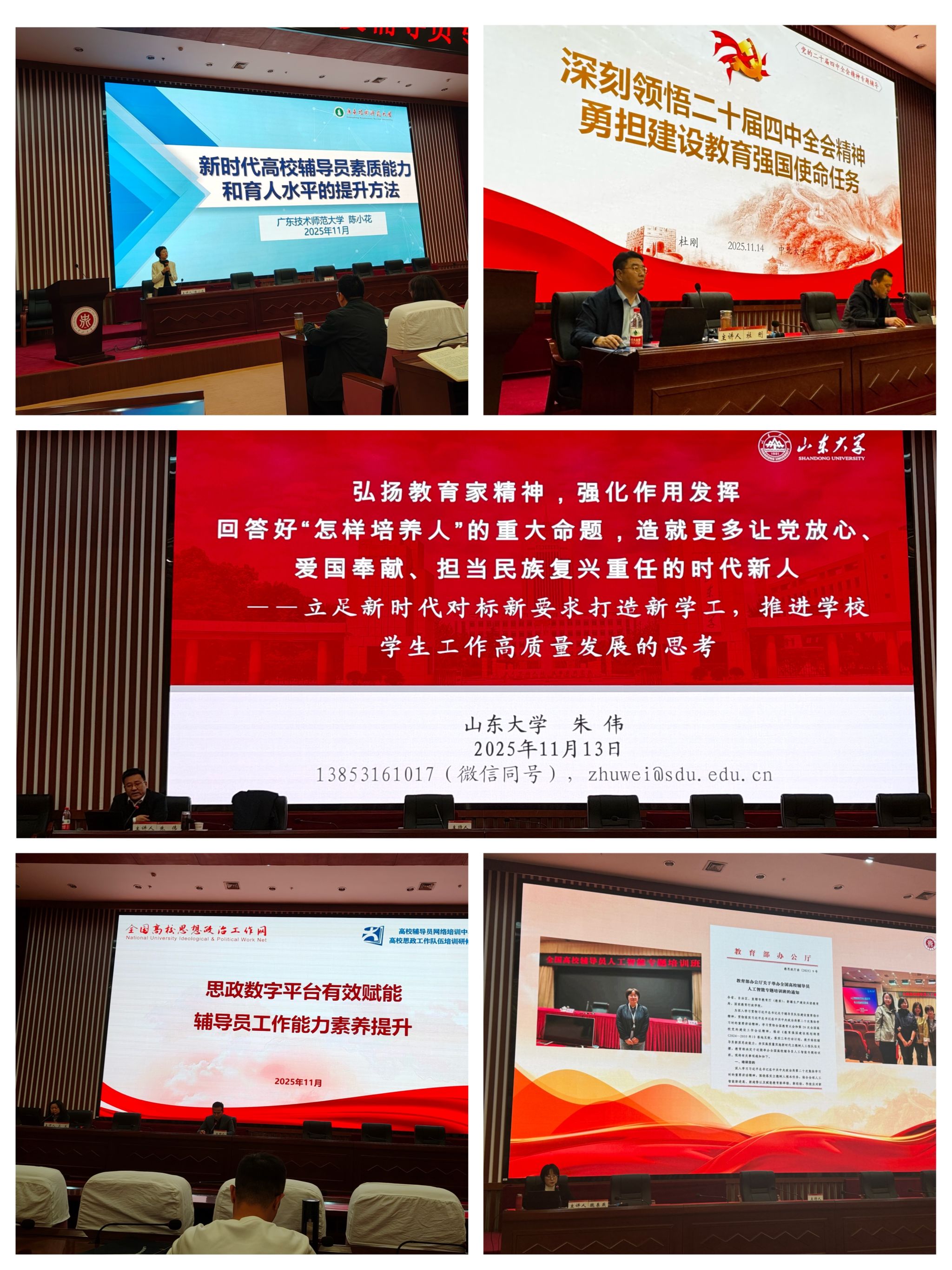 本次研修班分为专题讲座、实践教学和学思分享三个部分。专题讲座环节,广东技术师范大学网络空间安全学院党委书记陈小花教授,山东大学艺术学院党委副书记朱伟教授,中教华影思政教育工作部副主任苏兰副研究员,山西中医药大学马克思主义学院执行院长杜刚教授,中北大学仪器与电子学院党委副书记、第十五届全国高校辅导员年度人物魏春燕老师分别就《新时代高校辅导员素质能力和育人水平的提升方法》、《弘扬教育家精神,强化作用发挥,回答好“怎样培养人”的重大命题》、《思政数字平台有效赋能辅导员素质能力提升》、《深刻领悟二十届四中全会精神勇担教育强国建设使命任务》、《精准思政视域下高校辅导员工作的“道”与“术”》展开论述。讲座内容丰富,指导性强,参训学员纷纷表示很受启发。