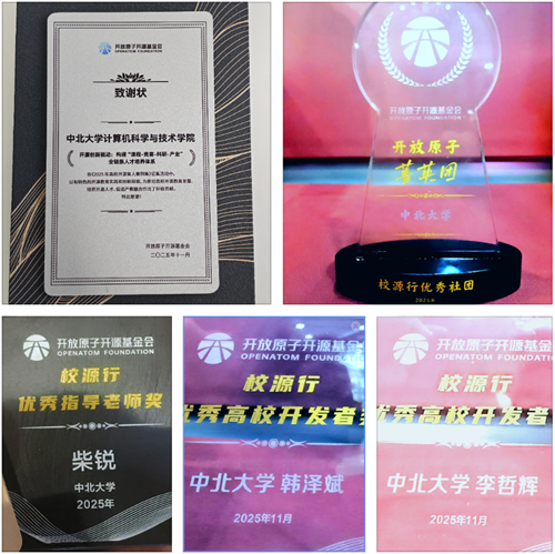 集体荣誉方面:中北大学被授予“开源鸿蒙人才生态年度院校”称号,标志着学校在OpenHarmony生态建设与开源鸿蒙人才培养方面走在全国高校前列。中北大学计算机科学与技术学院也因在开源教育方面的创新实践,获基金会特别致谢;学院以“开源创新驱动”为主线,构建了“课程-竞赛-科研-产业”全链条人才培养体系,为推动高校开源教育发展、深化产教融合作出了积极贡献,相关案例入选《2025年高校开源育人案例集》。中北大学开放原子菁英团荣获“校源行优秀社团”称号,展现了学校在开源社区建设与学生组织培育方面的显著成效。