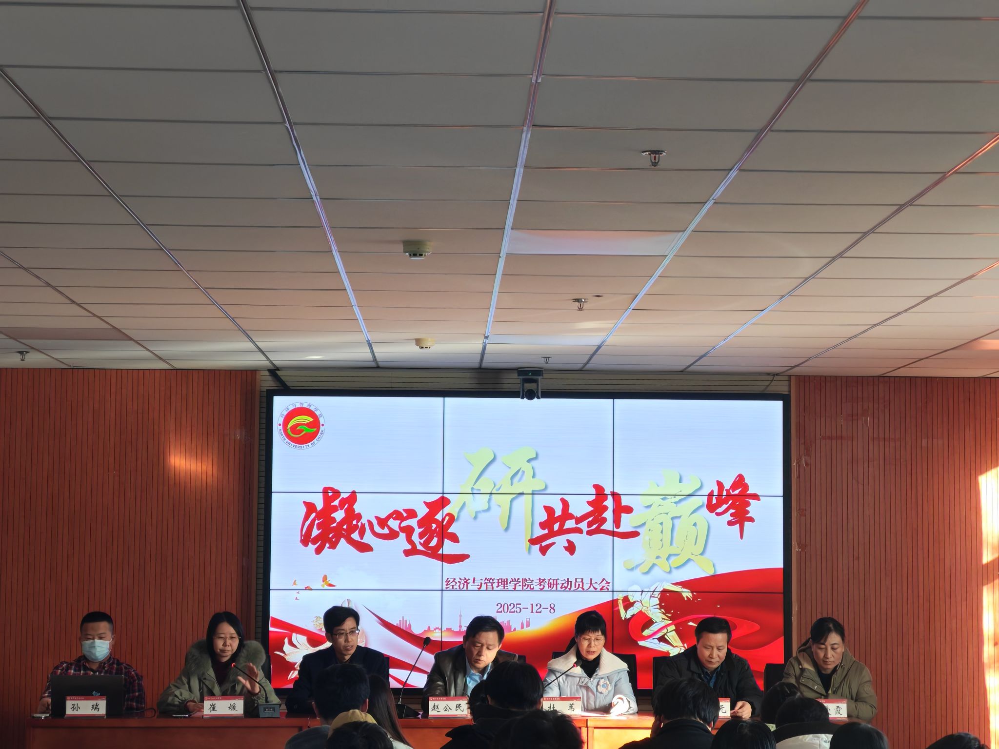 为引导学子明确目标,坚定信心,科学备考。12月8日,经济与管理学院在逸夫楼南楼301会议室举行2026届考研动员大会。党政领导班子全体成员、毕业班班主任及全体考研学子欢聚一堂,共同吹响考研冲刺的号角。