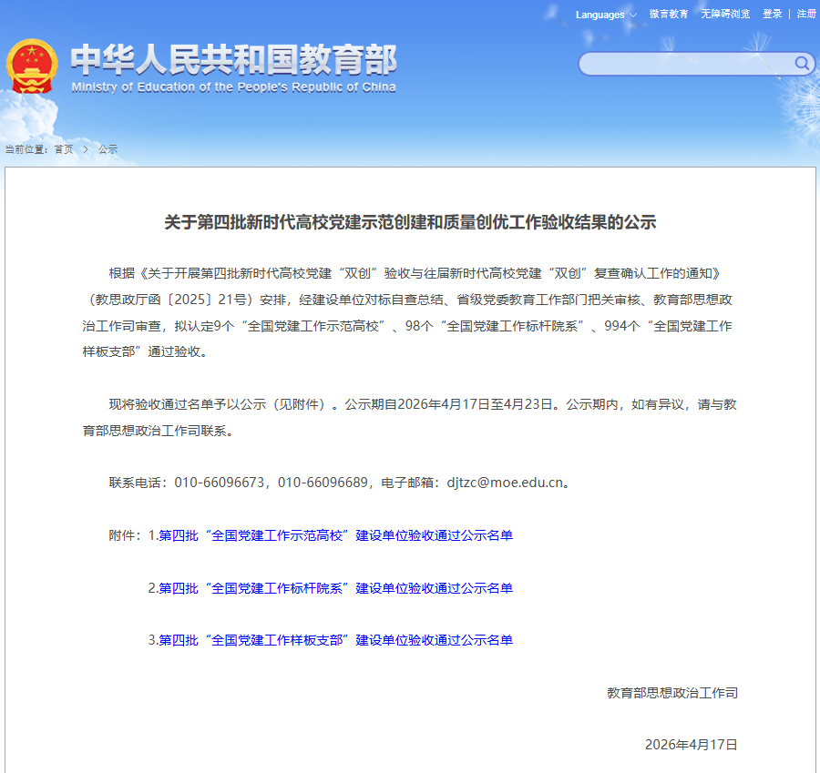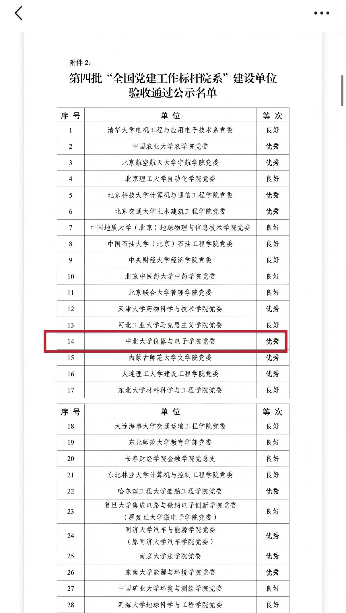 2026年4月17日,教育部公示第四批新时代高校党建示范创建和质量创优工作验收结果,中北大学仪器与电子学院党委通过验收,并斩获“优秀”等次,标志着学院党建工作与事业发展深度融合的实践取得显著成效。