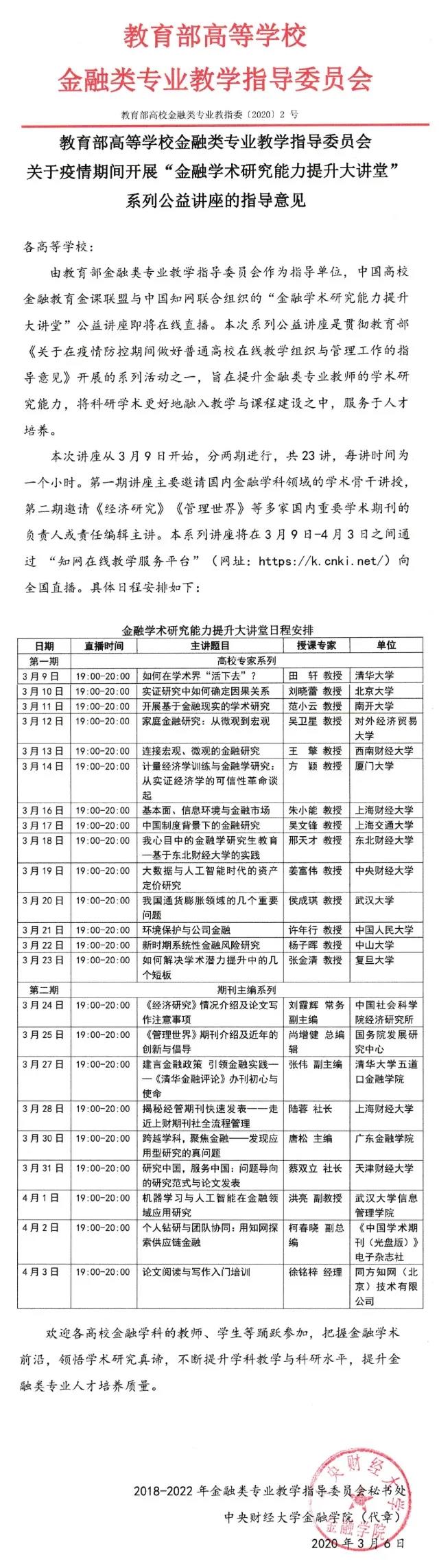图书馆携知网与中国高校金融教育金课联盟联合组织的“金融学术研究能力提升大讲堂”系列公益讲座将于3月9日至4月3日在“知网在线教学服务平台”直播,直播观看方式和日程安排如下: