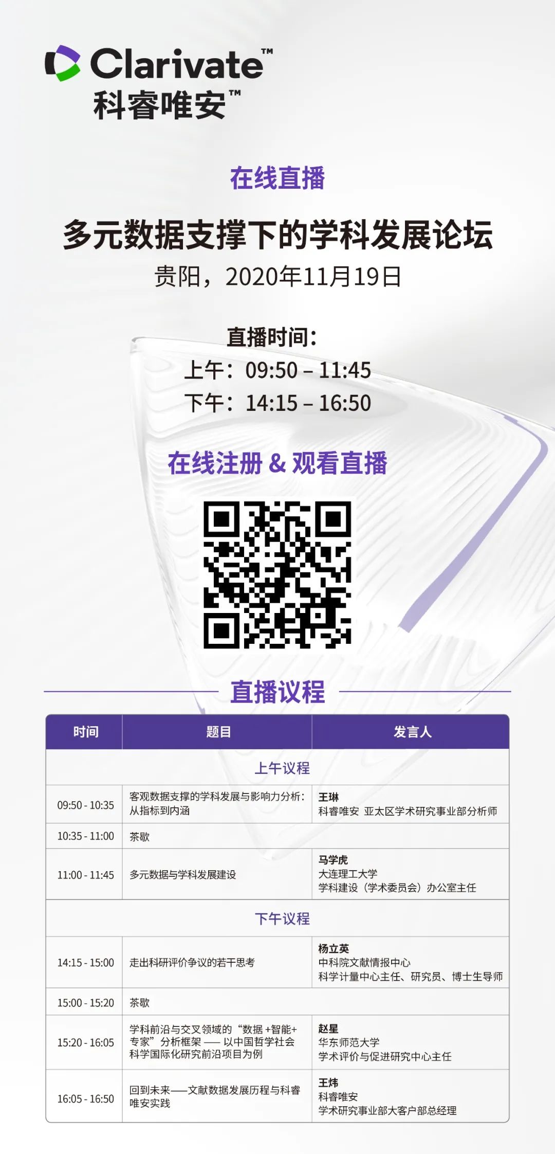 一流大学建设要以一流学科为基础,以一流学科为引领。作为全球领先的信息服务机构,科睿唯安一直致力于为中国及全球科研和教育界提供一流的数据和专业服务。为了分享和交流近年来中国高校坚持特色一流、内涵发展,利用多元数据推进一流学科发展的成功经验,科睿唯安将于2020年11月19日(周四)在贵阳举办 “多元数据支撑下的学科发展论坛”。本次论坛将进行线上直播,欢迎大家届时同步线上观看。