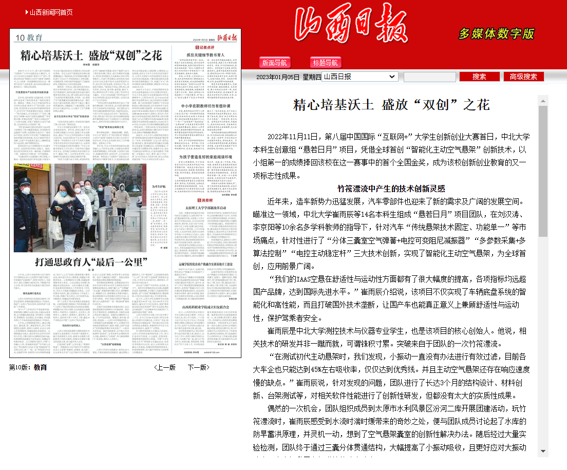 2022年11月11日,第八届中国国际“互联网+”大学生创新创业大赛首日,中北大学本科生创意组“悬若日月”项目,凭借全球首创“智能化主动空气悬架”创新技术,以小组第一的成绩捧回该校在这一赛事中的首个全国金奖,成为该校创新创业教育的又一项标志性成果。