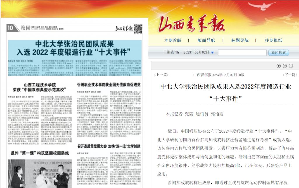 【山西青年报】中北大学张治民团队成果入选2022年度锻造行业“十大事件”