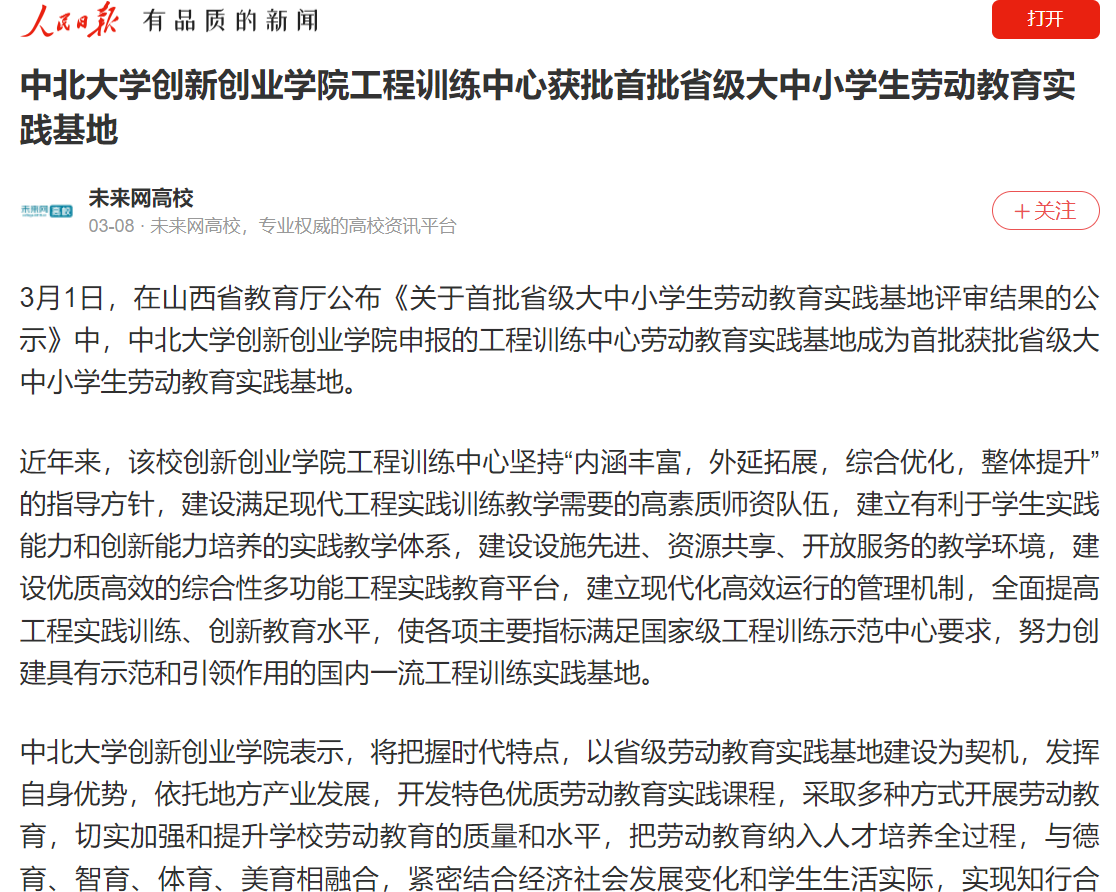 【人民日报】中北大学创新创业学院工程训练中心获批首批省级大中小学生劳动教育实践基地