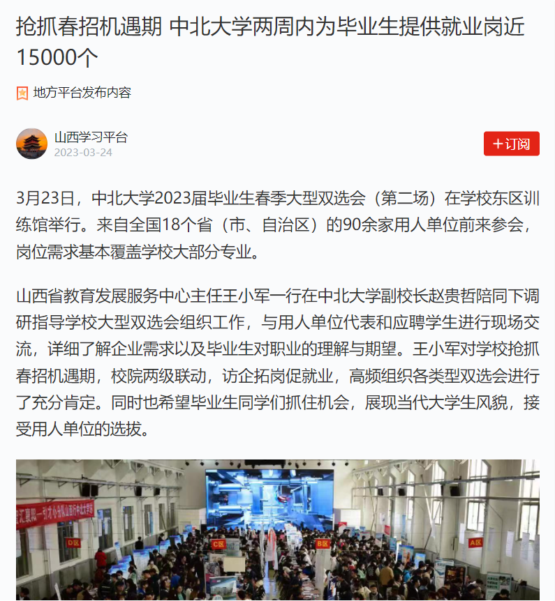 【学习强国】抢抓春招机遇期 中北大学两周内为毕业生提供就业岗近15000个