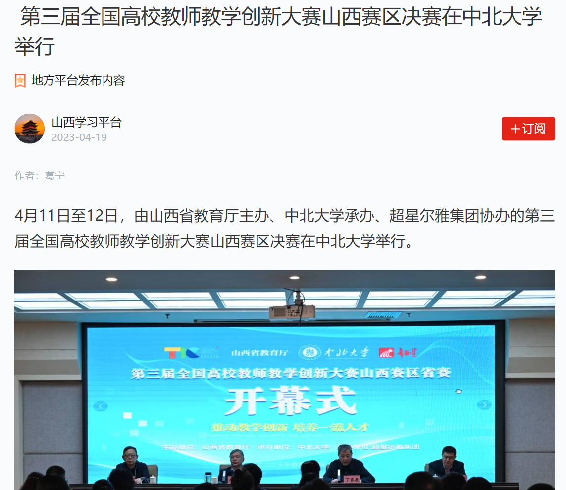 4月11日至12日,由山西省教育厅主办、中北大学承办、超星尔雅集团协办的第三届全国高校教师教学创新大赛山西赛区决赛在中北大学举行。