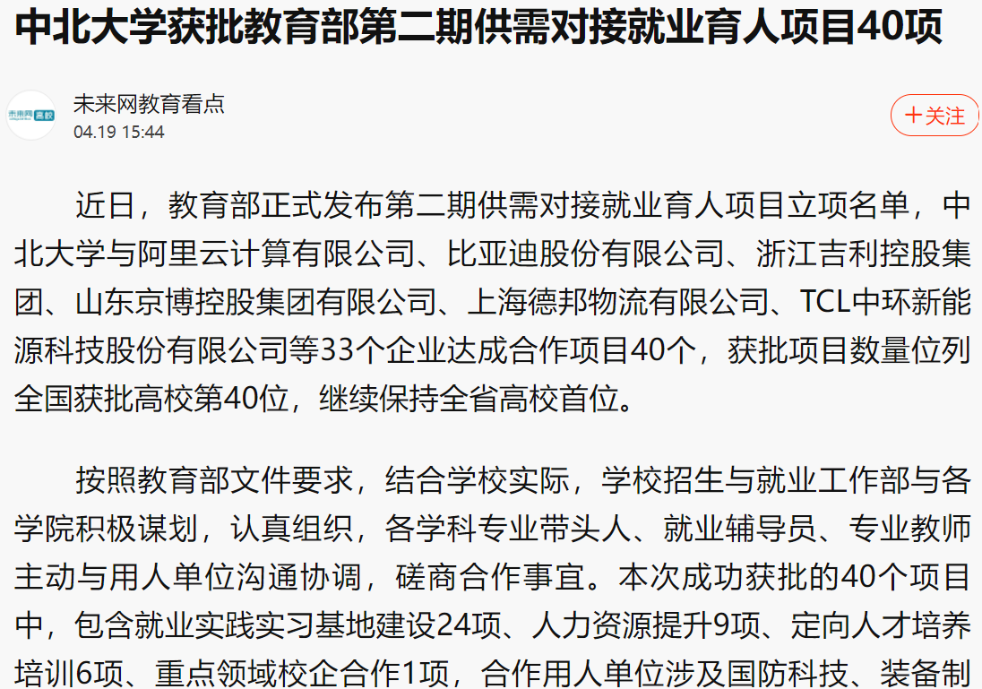 【新浪新闻】中北大学获批教育部第二期供需对接就业育人项目40项