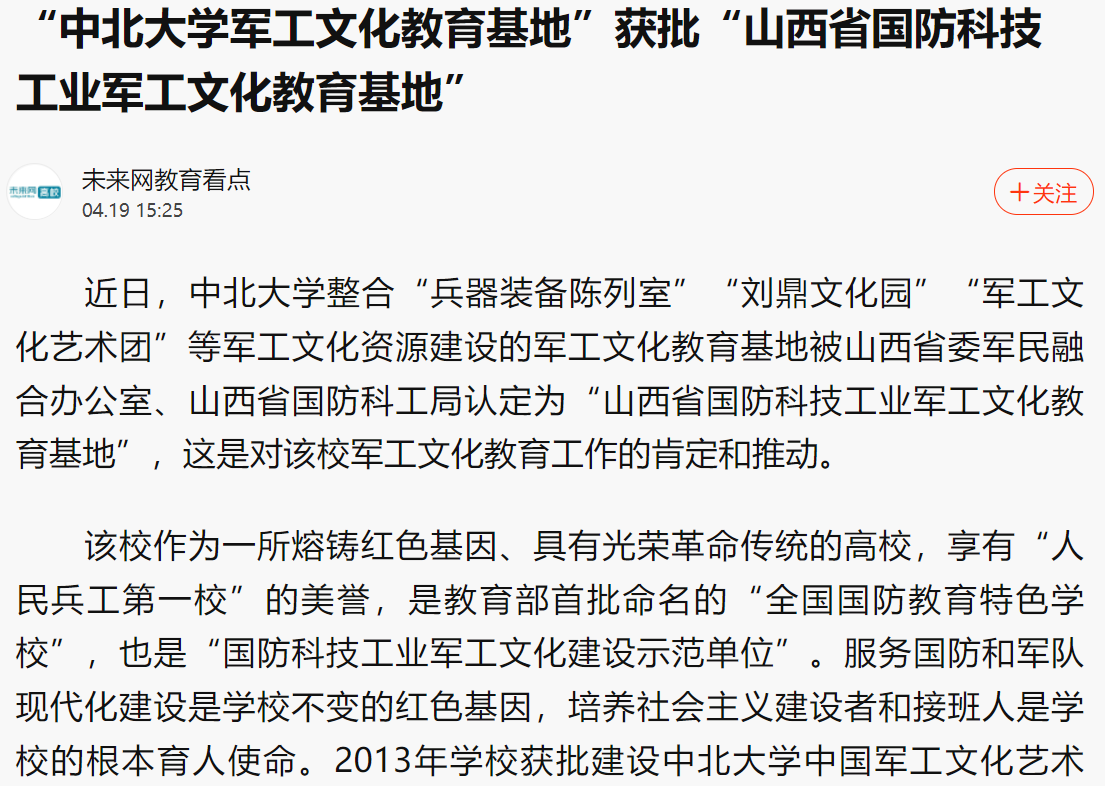 【新浪新闻】“中北大学军工文化教育基地”获批“山西省国防科技工业军工文化教育基地”