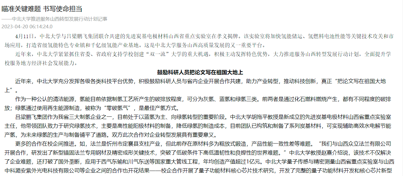 4月11日,中北大学与吕梁鹏飞集团联合共建的先进炭基电极材料山西省重点实验室在孝义揭牌。该实验室将加快氢能储运、氢燃料电池性能等关键技术攻关和市场应用,打造省级氢能特色专业镇和千亿级氢能产业基地。这是中北大学服务山西高质量发展的又一重要平台。