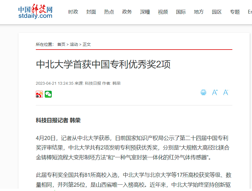 4月20日,记者从中北大学获悉,日前国家知识产权局公示了第二十四届中国专利奖评审结果,中北大学共有2项发明专利预获优秀奖,分别是“大规格大高径比镁合金铸棒短流程大变形制坯方法”和“一种气室封装一体化的红外气体传感器”。