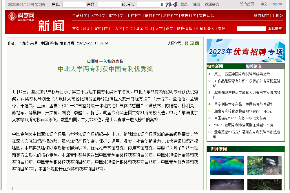 【中国科学报】山西唯一入榜的高校 中北大学两专利获中国专利优秀奖