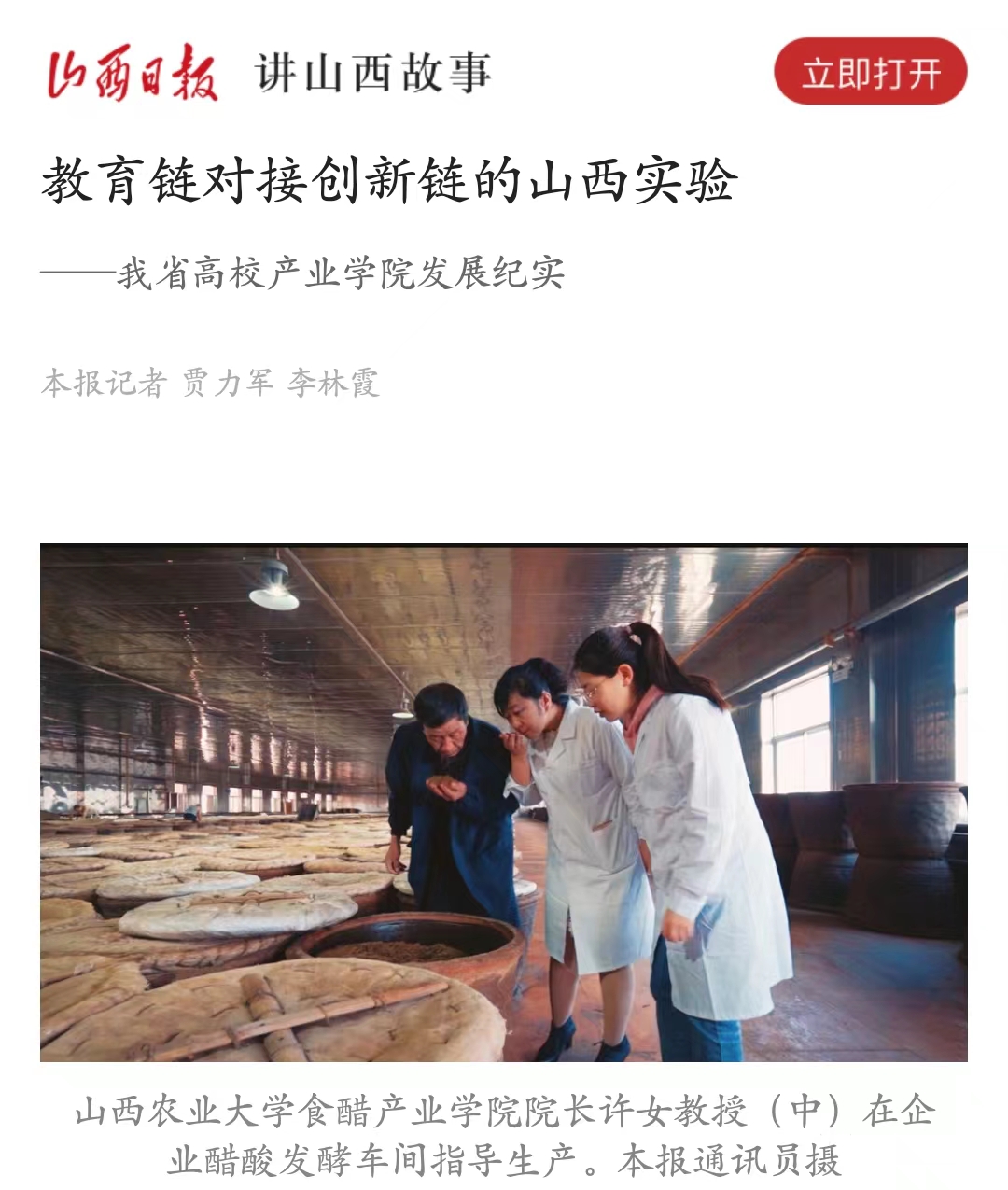 立足山西“特”“优”集群产业发展需求,联合行业龙头企业——山西紫林醋业、山西水塔醋业、山西美锦醋业以及山西老陈醋集团有限公司,充分发挥我省老陈醋产业技术战略创新联盟、山西省醋产业协会、清徐县政府的作用,共建现代产业学院。被认定为省级现代产业学院后,山西农大食醋产业学院发展思路和举措更为明晰,联合全产业链相关企业,建立产、学、研、用开放型合作平台;紧密对接食醋产业需求,构建新的食醋酿造专业、发酵专业知识体系;通过校企合作推动课程内容与食醋全产业链需求、科研攻关、项目实施、企业人才、科技创新短板等紧密衔接……