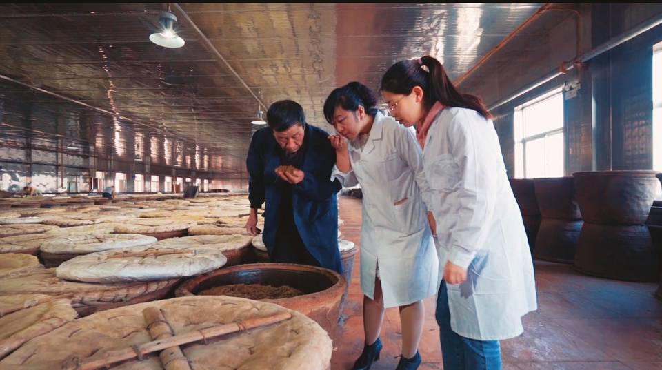 山西农业大学食醋产业学院院长许女教授(中)在企业醋酸发酵车间指导生产。本报通讯员摄