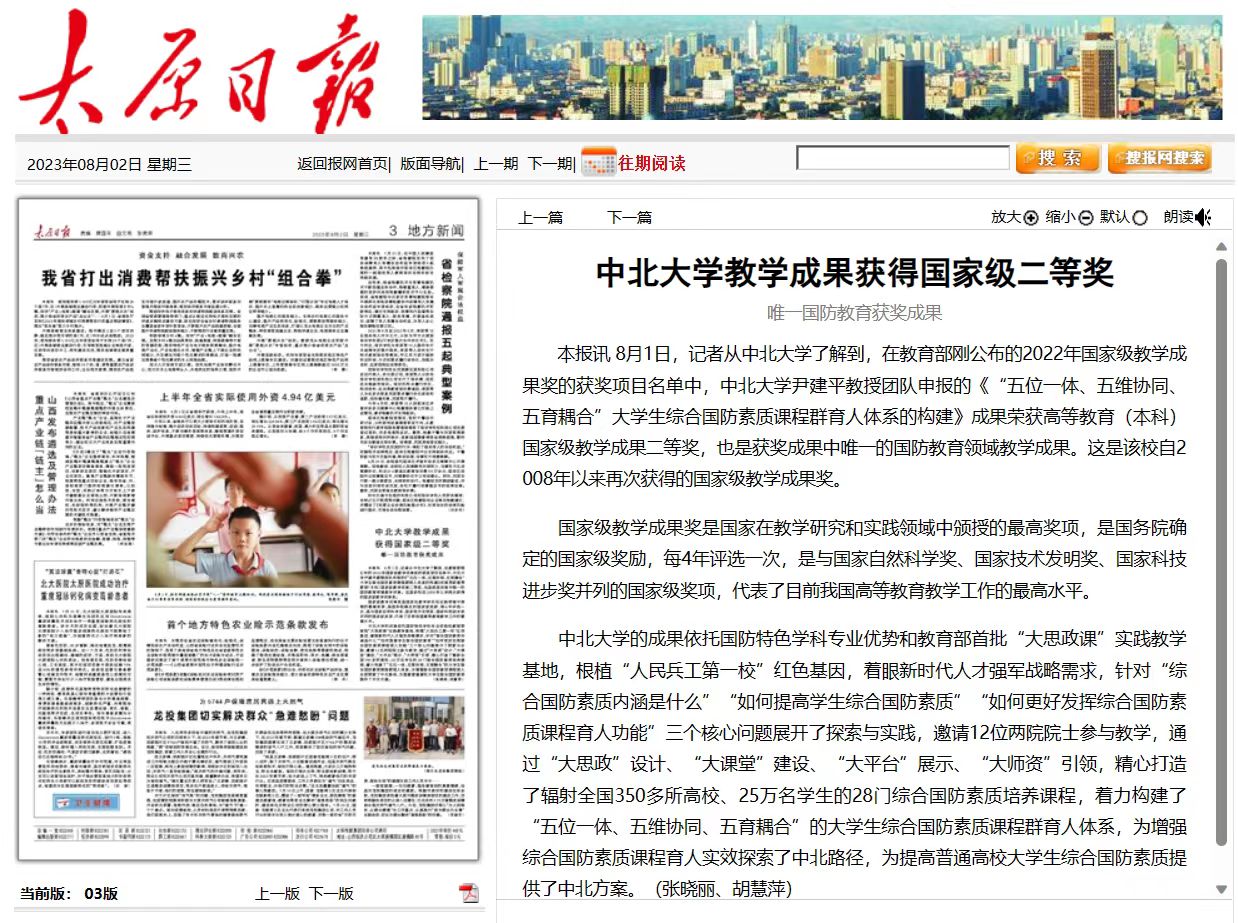 【太原日报】中北大学教学成果获得国家级二等奖 唯一国防教育获奖成果