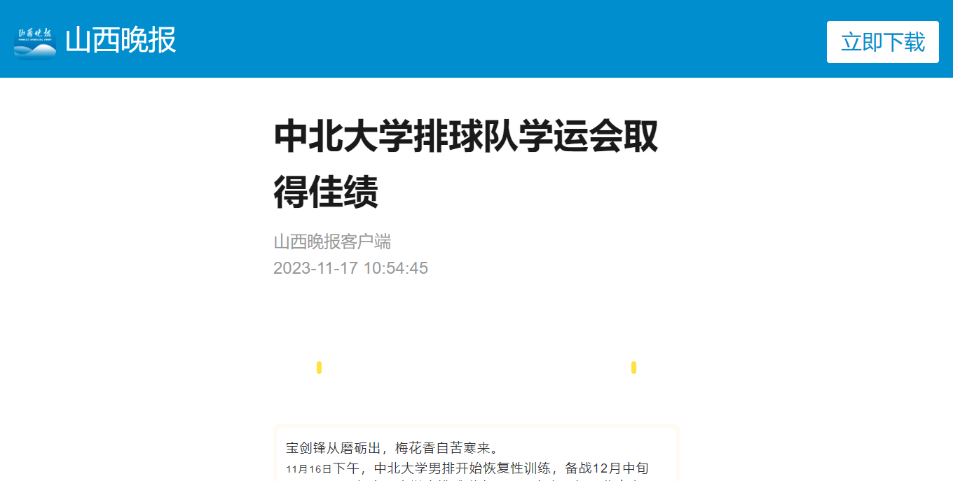 今年以来,中北大学排球队先后获得2022-2023年中国大学生排球联赛(高水平组)男子排球北方赛区第三名;2022-2023年中国大学生排球联赛(高水平组)男子排球总决赛第八名;第16届中国大学生沙滩排球锦标赛男子专业组第六名,阳光组男子组,女子组分别第三名;中国大学生沙滩排球精英赛女子组第三名等等佳绩。