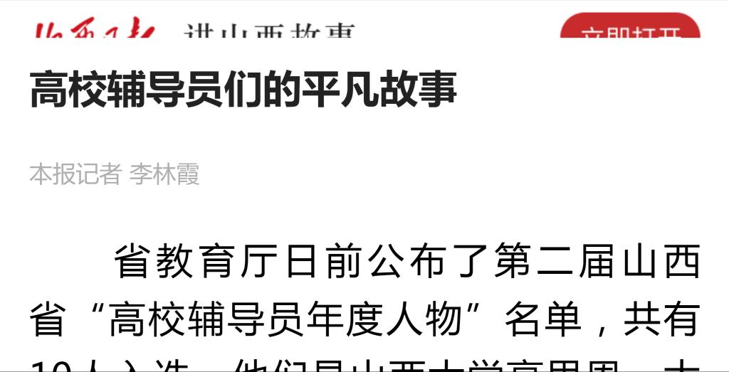 省教育厅日前公布了第二届山西省“高校辅导员年度人物”名单,共有10人入选,他们是山西大学高思恩、太原理工大学史圣洁、山西农业大学武路广、山西医科大学郭翠梅、山西财经大学陈思静、中北大学魏春燕、太原科技大学李明倩、太原工业学院赵倩、长治学院白凤麟、山西工商学院郭志凤。记者采访了其中3人,从她们的故事中一起管窥高校辅导员的工作和生活。