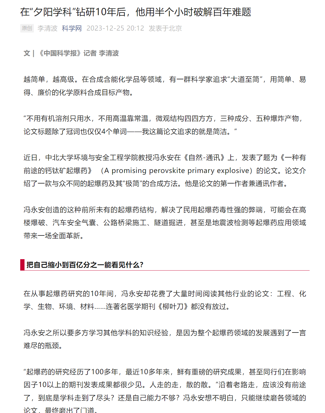 “起爆药的研究经历了100多年,最近10多年来,鲜有重磅的研究成果,甚至同行们在影响因子10以上的期刊发表成果都很少见。人走的走,散的散。”沿着老路走,应该没有前途了,到底是学科走到了尽头?还是自己能力不够?冯永安想不明白,只能继续磨各领域的论文,最终磨出了门道。
