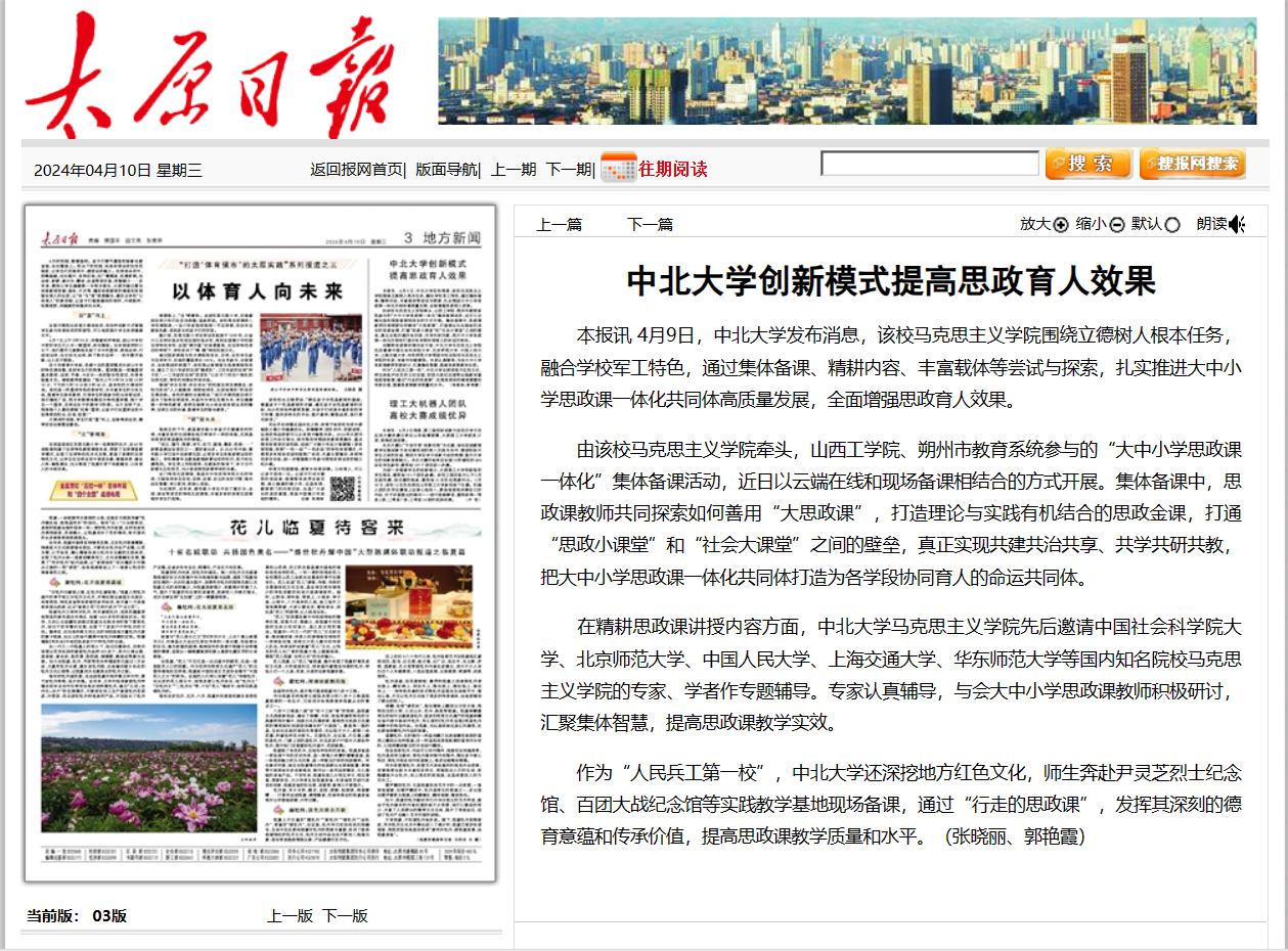 本报讯 4月9日,中北大学发布消息,该校马克思主义学院围绕立德树人根本任务融合学校军工特色,通过集体备课、精耕内容、丰富载体等尝试与探索,扎实推进大中小学思政课一体化共同体高质量发展,全面增强思政育人效果。