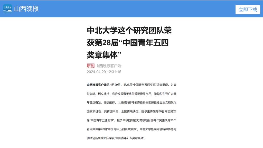 山西晚报客户端讯 4月29日,第28届“中国青年五四奖章”评选揭晓。为表彰先进、树立标杆,充分发挥青年典型模范带头作用,激励和引导广大青年踔厉奋发、砥砺前行,以昂扬的奋斗姿态投身全面建设社会主义现代化国家新征程,共青团中央、全国青联决定,授予王传超等30名同志第28届“中国青年五四奖章”,授予中铁四局雅万高铁项目部青年突击队等20个青年集体第28届“中国青年五四奖章集体”。中北大学极端环境特种传感与测试创新研究团队荣获“中国青年五四奖章集体”。