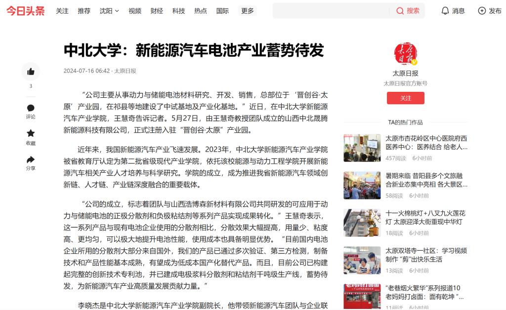 【太原日报】中北大学:新能源汽车电池产业蓄势待发
