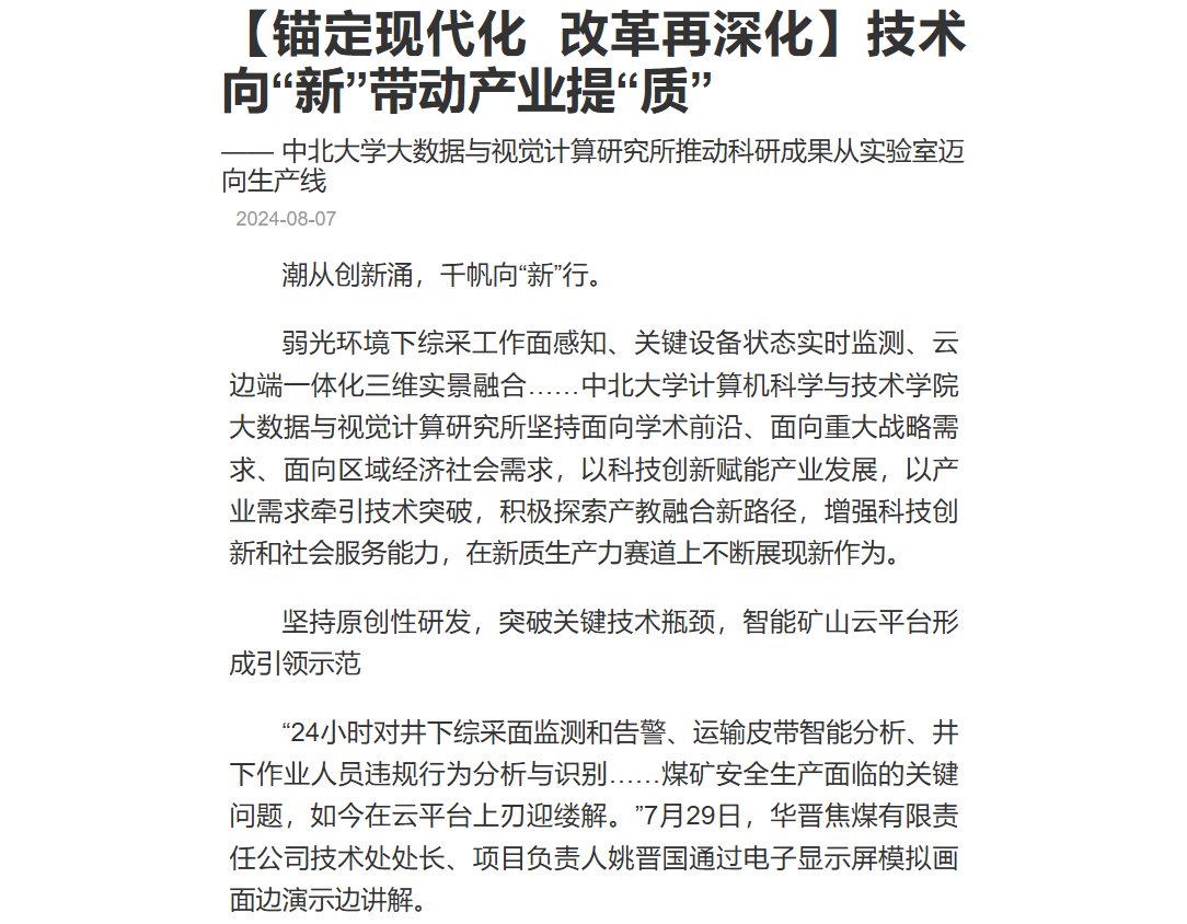 【山西日报】【锚定现代化 改革再深化】技术向“新”带动产业提“质” —— 中北大学大数据与视觉计算研究所推动科研成果从实验室迈向生产线