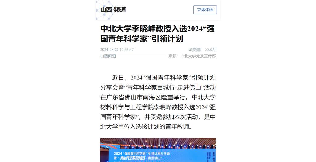 【山西频道】中北大学李晓峰教授入选2024“强国青年科学家”引领计划