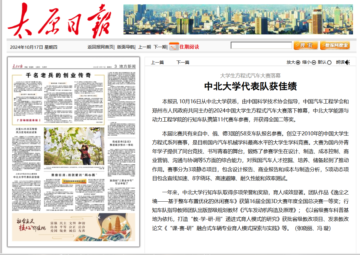 【太原日报】2024中国大学生方程式汽车大赛落幕 中北大学代表队获佳绩