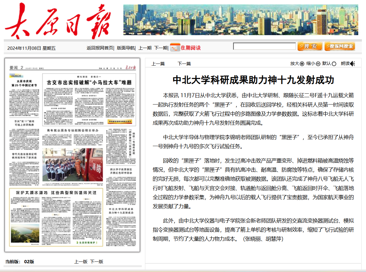 【太原日报】中北大学科研成果助力神十九发射成功