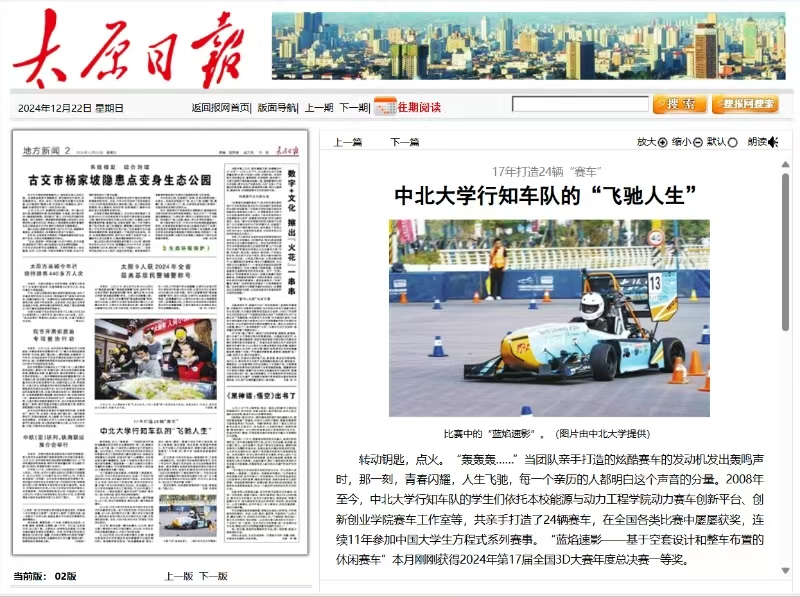 转动钥匙,点火。“轰轰轰……”当团队亲手打造的炫酷赛车的发动机发出轰鸣声时,那一刻,青春闪耀,人生飞驰,每一个亲历的人都明白这个声音的分量。2008年至今,中北大学行知车队的学生们依托本校能源与动力工程学院动力赛车创新平台、创新创业学院赛车工作室等,共亲手打造了24辆赛车,在全国各类比赛中屡屡获奖,连续11年参加中国大学生方程式系列赛事。“蓝焰速影——基于空套设计和整车布置的休闲赛车”本月刚刚获得2024年第17届全国3D大赛年度总决赛一等奖。