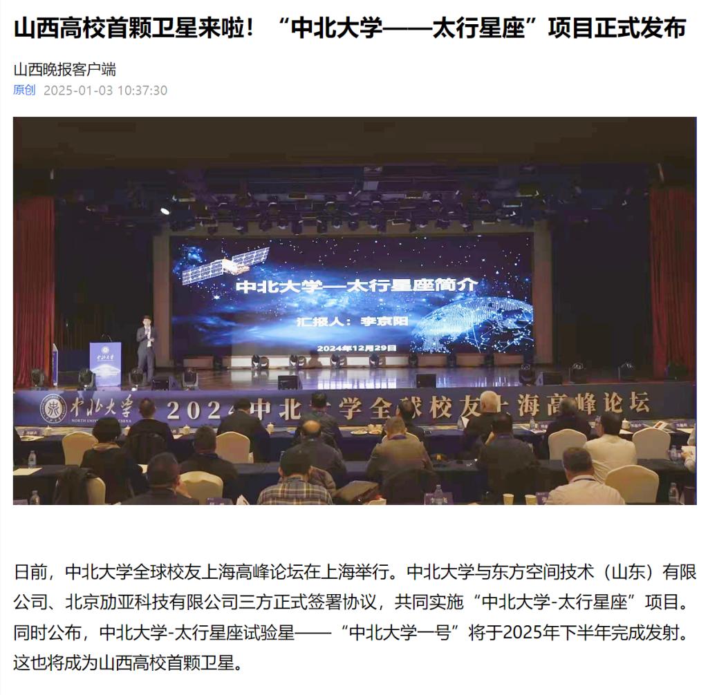 日前,中北大学全球校友上海高峰论坛在上海举行。中北大学与东方空间技术(山东)有限公司、北京劢亚科技有限公司三方正式签署协议,共同实施“中北大学-太行星座”项目。同时公布,中北大学-太行星座试验星——“中北大学一号”将于2025年下半年完成发射。这也将成为山西高校首颗卫星。