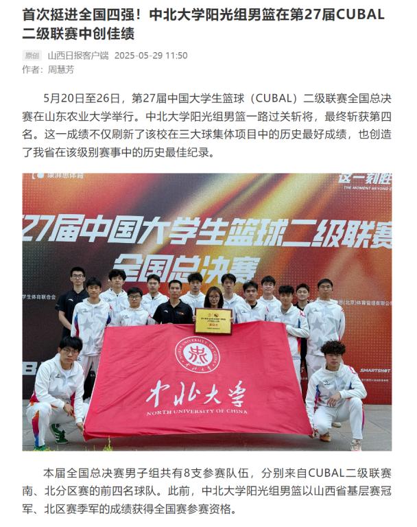 【山西日报】首次挺进全国四强!中北大学阳光组男篮在第27届CUBAL二级联赛中创佳绩