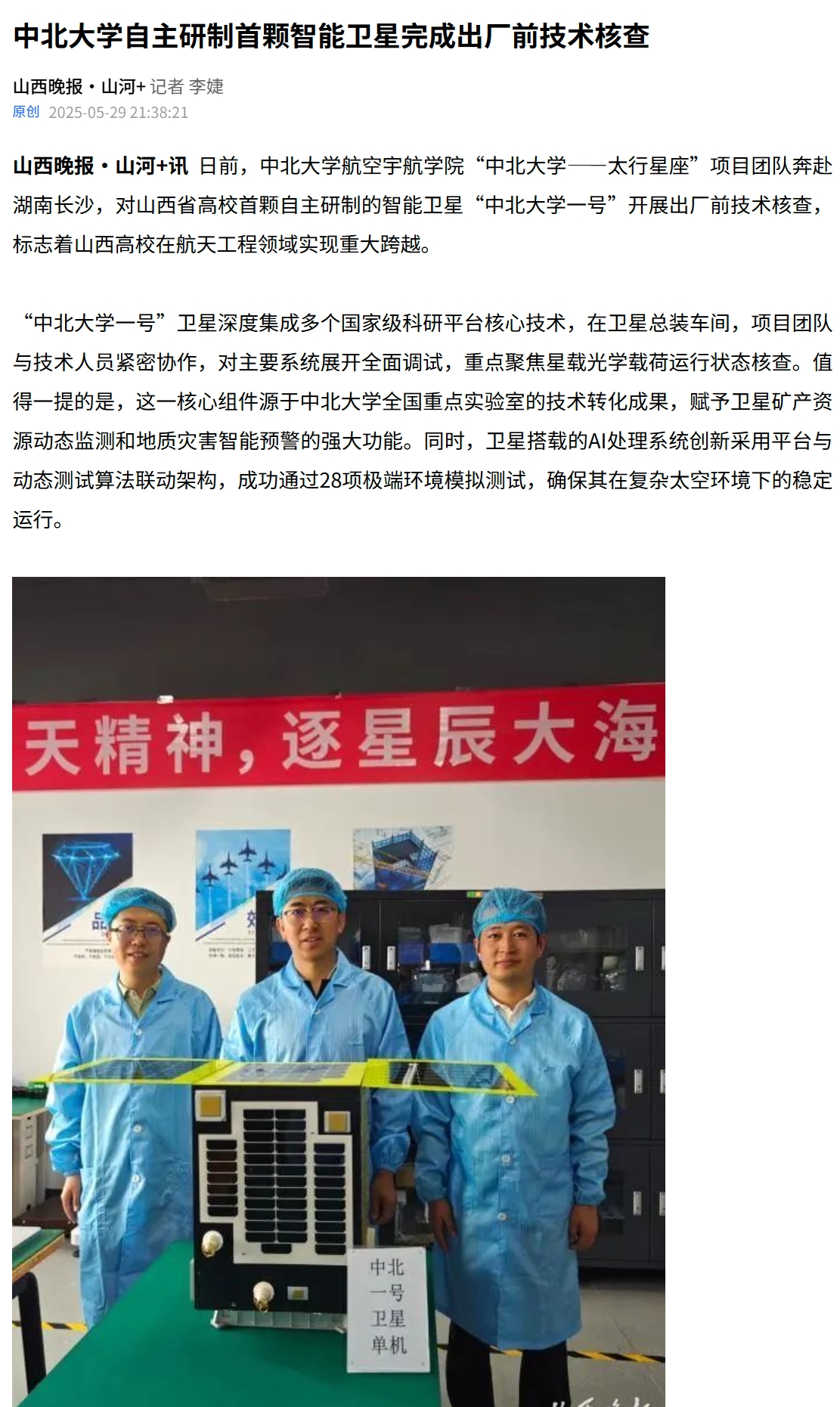 该卫星的研制成功,创造了山西高校三项航天纪录:不仅是山西高校首颗自主研制的智能卫星,还构建了首个“设计—制造—测控”全流程贯通的教学科研平台,同时打造了首个军民两用载荷平台。其技术体系充分融合中北大学仪器科学与兵器工程学科优势,成为“双一流”学科交叉创新的典范。