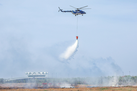 在我省举行的2024年航空应急救援综合演练中,直升机现场演练吊桶洒水项目。山西日报通讯员摄