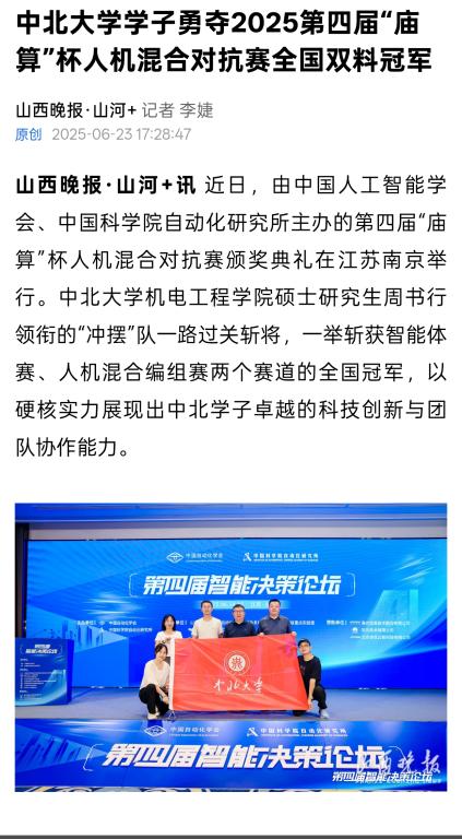 【山西晚报】中北大学学子勇夺2025第四届“庙算”杯人机混合对抗赛全国双料冠军