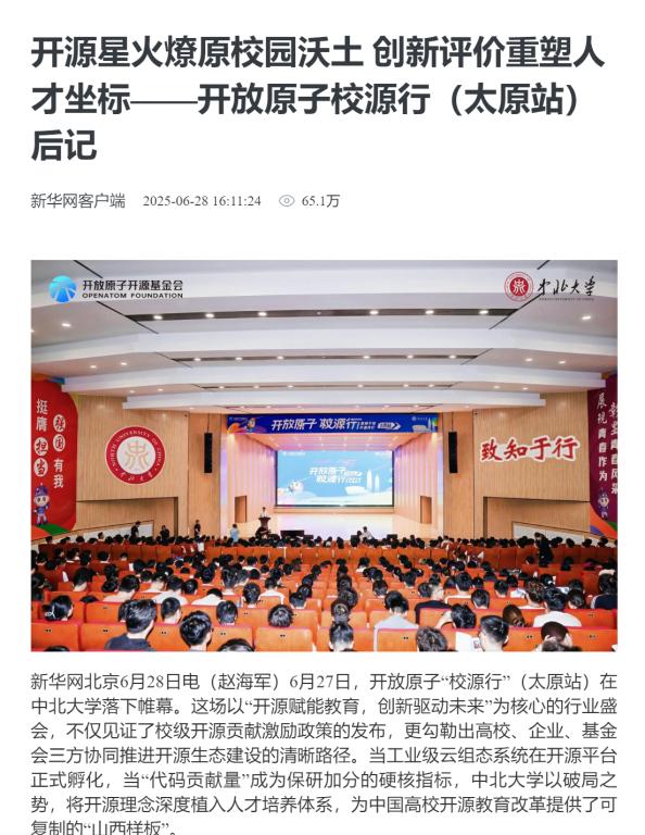 新华网北京6月28日电(赵海军)6月27日,开放原子“校源行”(太原站)在中北大学落下帷幕。这场以“开源赋能教育,创新驱动未来”为核心的行业盛会,不仅见证了校级开源贡献激励政策的发布,更勾勒出高校、企业、基金会三方协同推进开源生态建设的清晰路径。当工业级云组态系统在开源平台正式孵化,当“代码贡献量”成为保研加分的硬核指标,中北大学以破局之势,将开源理念深度植入人才培养体系,为中国高校开源教育改革提供了可复制的“山西样板”。