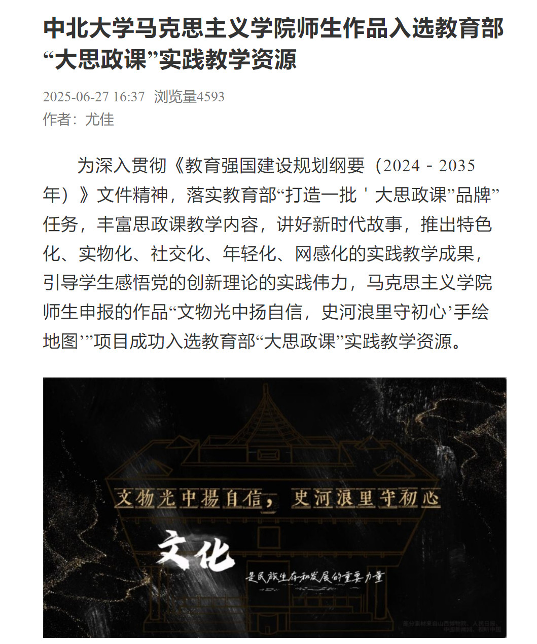 为深入贯彻《教育强国建设规划纲要(2024-2035年)》文件精神,落实教育部“打造一批'大思政课”品牌”任务,丰富思政课教学内容,讲好新时代故事,推出特色化、实物化、社交化、年轻化、网感化的实践教学成果,引导学生感悟党的创新理论的实践伟力,马克思主义学院师生申报的作品“文物光中扬自信,史河浪里守初心’手绘地图’”项目成功入选教育部“大思政课”实践教学资源。