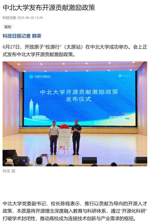 6月27日,开放原子“校源行”(太原站)在中北大学成功举办。会上正式发布中北大学开源贡献激励政策。