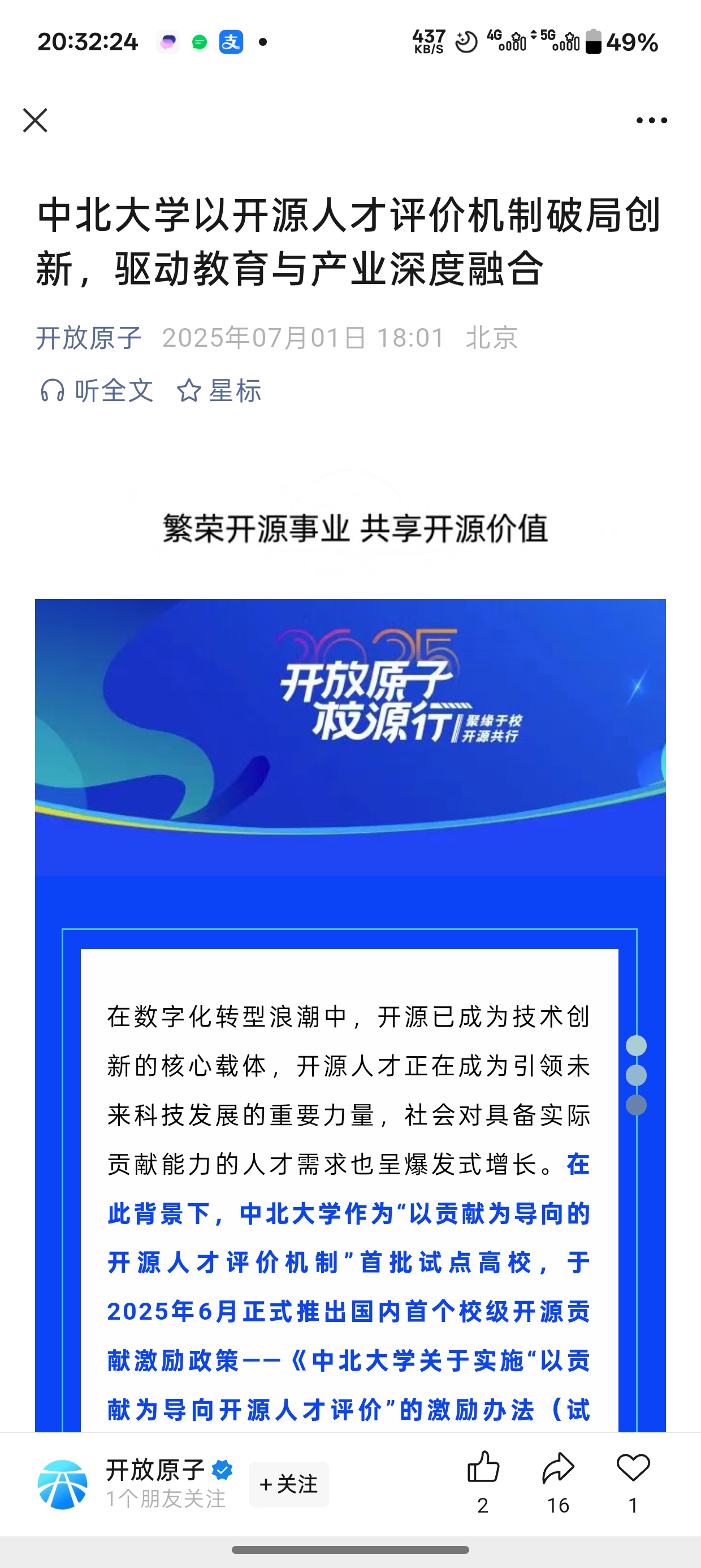 从政策创新到项目落地,从中北大学的校园实践到山西区域的生态构建,“以贡献为导向的开源人才评价机制”正以实际成效证明:当教育评价与产业需求同频共振,开源将成为撬动技术创新与人才培养的重要杠杆,为我国科技自立自强筑牢人才底座。