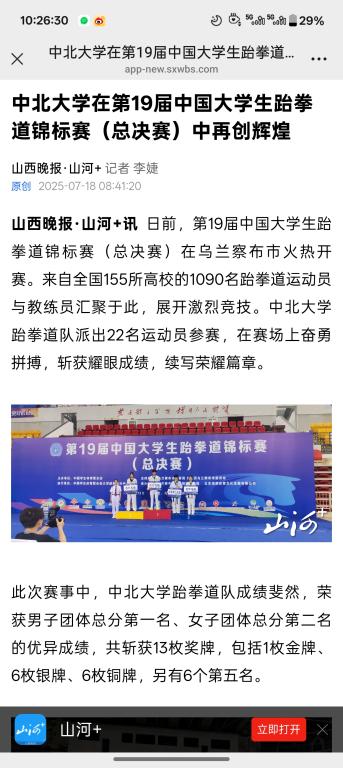 【山西晚报】中北大学在第19届中国大学生跆拳道锦标赛(总决赛)中再创辉煌